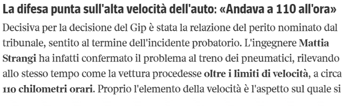 L’ingegnere Mattia Strangi ha infatti confermato il problema al treno dei pneumatici, rilevando allo stesso tempo come la vettura procedesse oltre i limiti di velocità, a circa 110 chilometri orari.